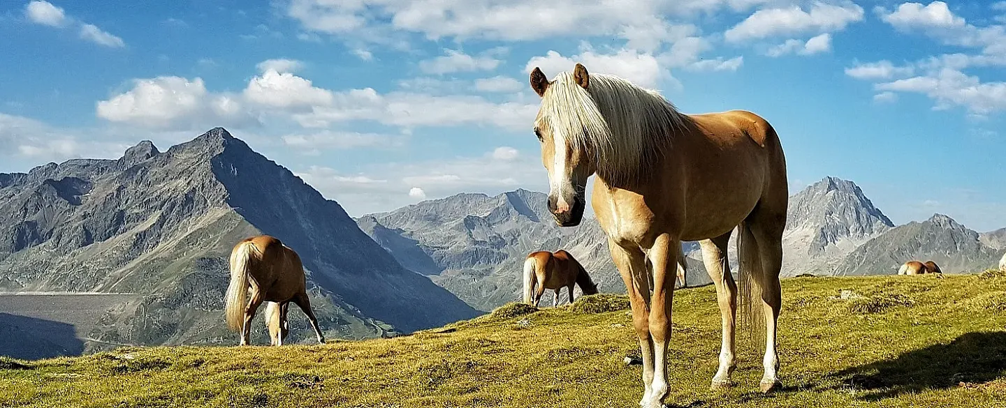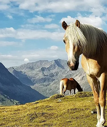 This natural husbandry and a common alpine pasturing of at least six months a year provides excellent rearing for tyrolean haflinger horses. These rearing conditions are not only especially animal-friendly and species-appropriate for the horse as a herd animal, but they are also the prerequisites for ensuring their natural characteristics. This excursion into the Tyrolean Alps, at a height of over 1,200 metres above sea level, is essential for the surefootedness, stamina, hardiness, resilience and strong health of the horses. Natural meadows with wild herbs, which have never been fertilised since the purchase of the pasture by the Tyrolean Haflinger Breeding Association and it’s breeders since founding, provide an ideal feeding basis. Rocks and high mountain woodland are also very original, with a great variety of different trees, and they ensure dexterity and surefootedness. Large differences in temperature, from 30 degrees during the day and frost at night, guarantee a natural hardiness. There is also an onset of winter many times a year, when the herd often spends a number of days in the snow. Chamois can frequently be seen among the stallions on the meadow, which is located in an extremely high mountain region. This hard, yet natural rearing of course applies to all Tyrolean Haflinger horses and foals at auction, and guarantees well-balanced and healthy top-class horses. Haflinger horses from Tirol are a trademark.